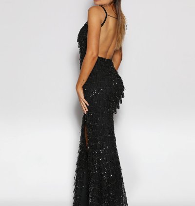 Jadore style JX2012 is an Elegant full length sequin fringed formal gown with sheer insert in the plunging V neckline. The low square back is secured with shoestring lacing. The gown also features a short train and elegant leg split.