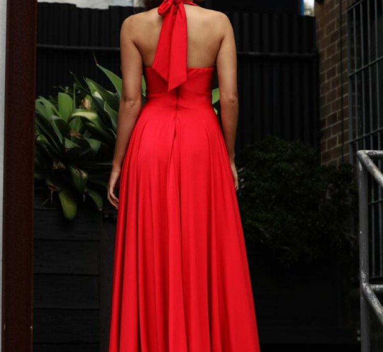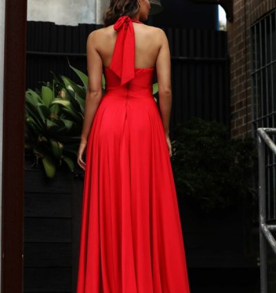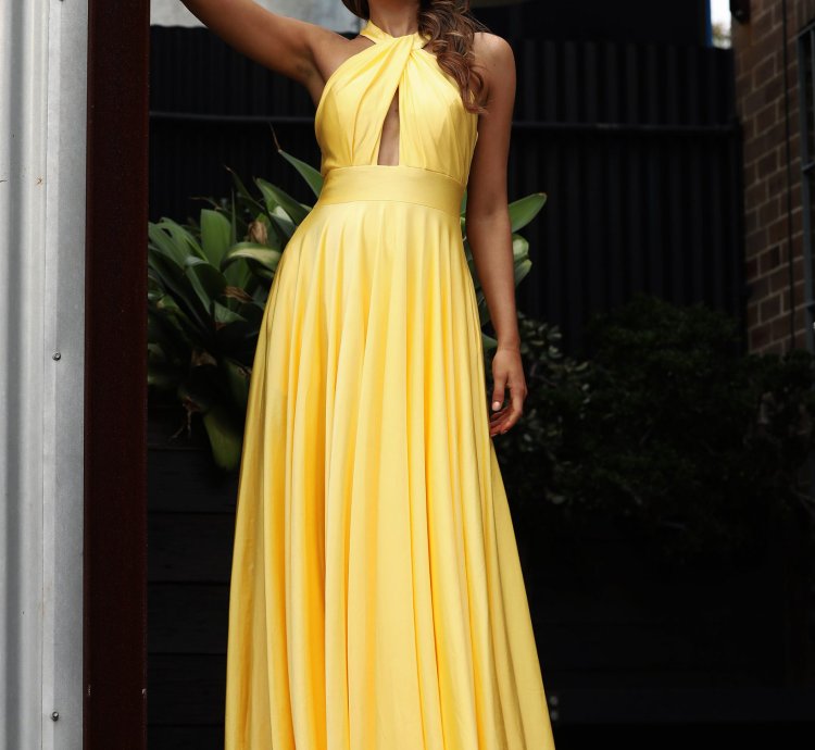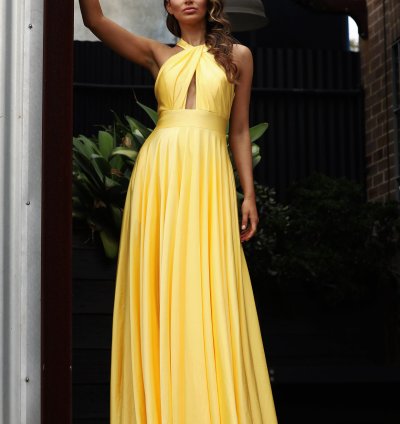 Floor length halterneck ball gown from Jadore. Stunning yellow colour featuring a fitted halter bodice with keyhole cut-out, full circle skirt