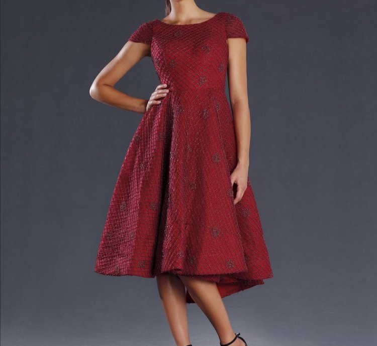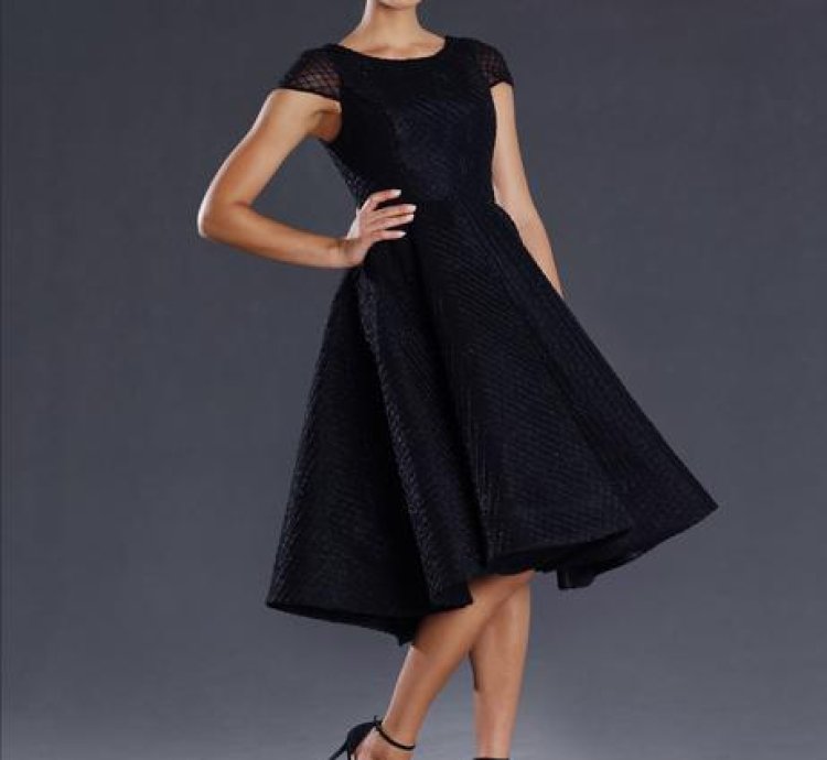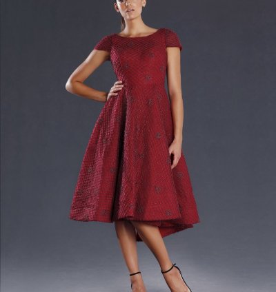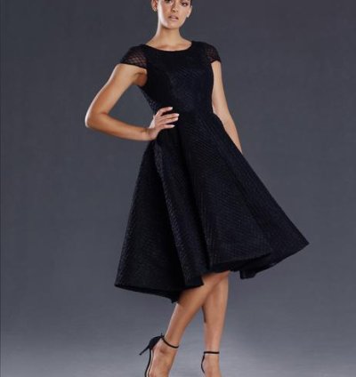 This Striking knee length Party dress, formal dress, fashions on the field outfit or special occasion dress has a high scoop neck, slight cap sleeve, a full circle skirt and unique beading detail. The cinched waist and circle skirt emphasise a small waist. The skirt is lined with a stiffener to ensure it holds the shape (could be made fuller with the addition of a hoop). The fit of this gown is stunning and will turn heads.