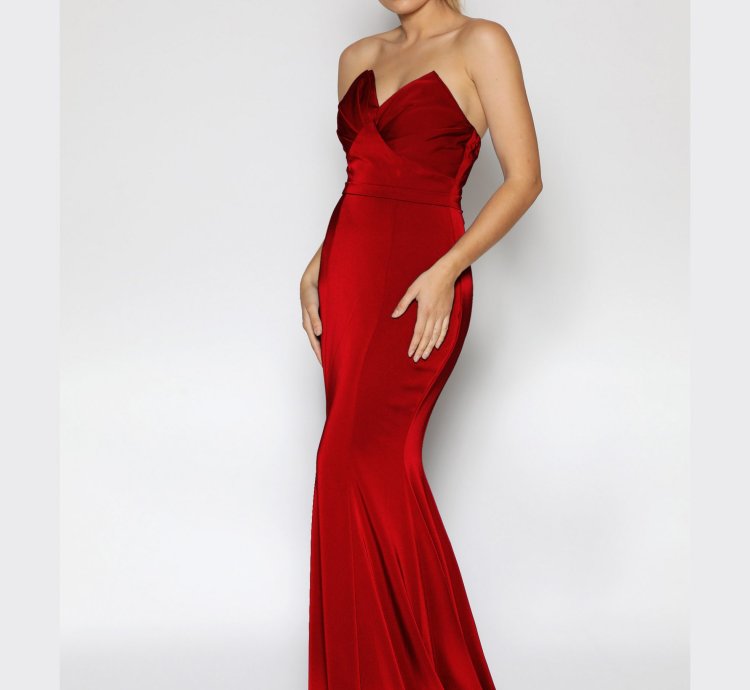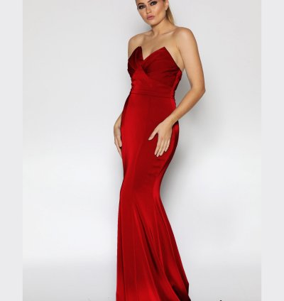 An elegant full length gown in a luxurious stretch satin by Jadore. Featuring a pointed sweetheart neckline and narrow waistband. The elegant fit and flare silhouette also features pleating over the bust and a short train. The gown is fully lined and a contains boning and moulded cups.