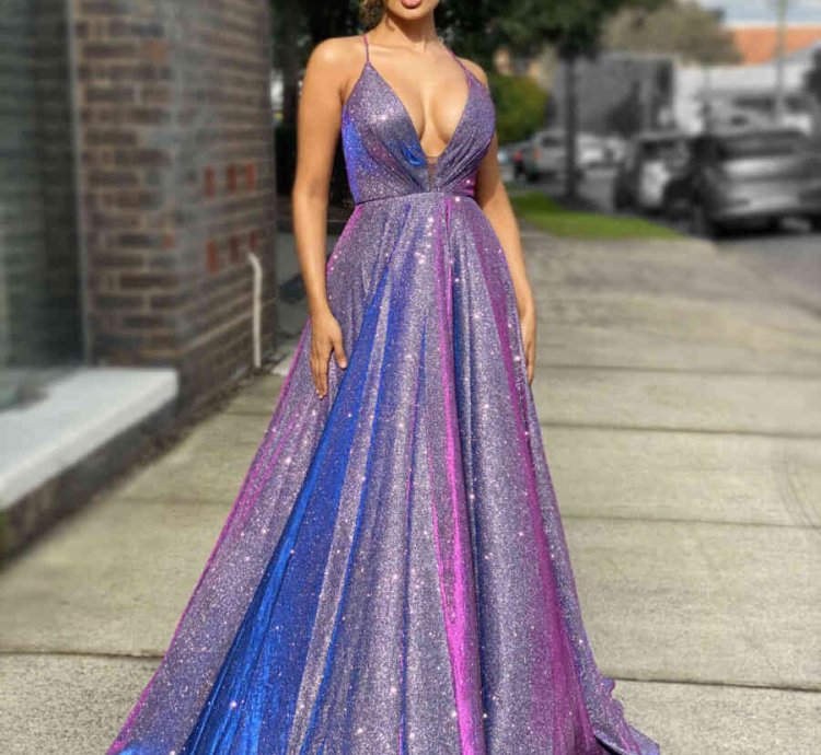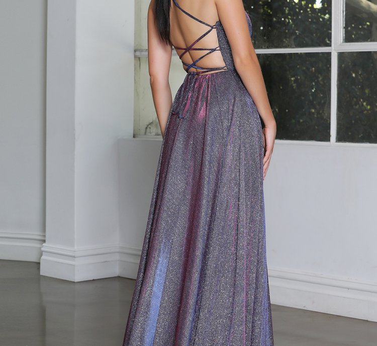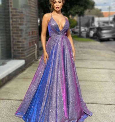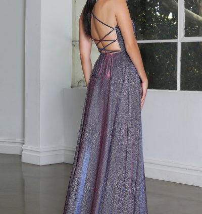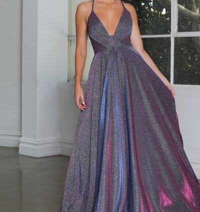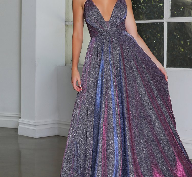 Floor length V neck ball gown from Jadore. Stunning glitter fabric featuring a plunging V neck bodice with shoe string straps, low back & full circle skirt. HAS POCKETS!!! Perfect for your next formal occasion.